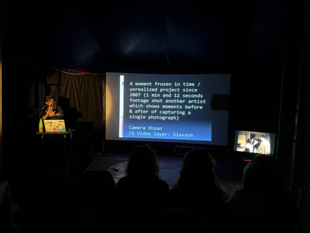 A looped moment, before/after a photograph is taken was merely recorded on a Mini DV camera, the footage which has been discovered years later is now 21 years old, shot briefly In a friend’s kitchen sometime between Dec 2003 or Jan 2004. Amirali’s attempt to apply the while layers to the frames manually was not successful and the project eventually shelved for years. Activation of the project was only made possible through Siavash’s generous offer to find a solution of how to track the Shakey camera and many moving subjects in this short clip (including a dog!).